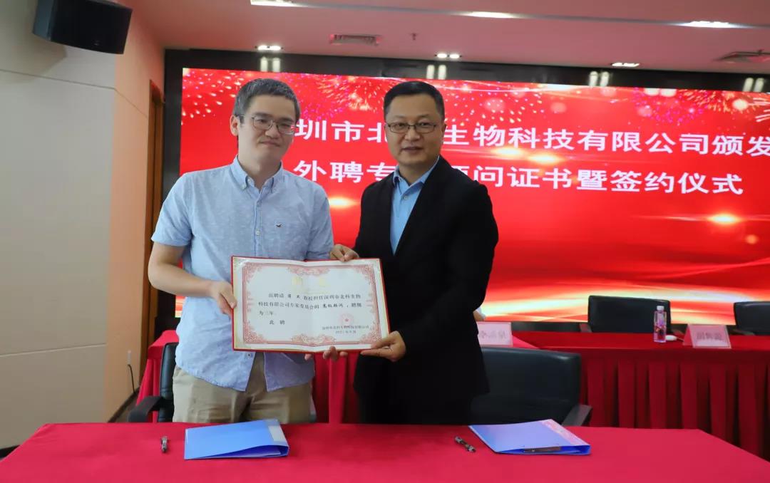 9月29日下午,為推動公司實現(xiàn)高質(zhì)量的發(fā)展,提升公司的核心競爭力,深圳市北科生物科技有限公司舉行了頒發(fā)外聘專家顧問證書暨合作項目簽約儀式。北科生物董事長胡雋源博士與蔣衛(wèi)教授簽訂《合作項目意向書》并頒發(fā)外聘專家顧問證書。蔣衛(wèi)教授是武漢大學醫(yī)學研究院教授、中南醫(yī)院特聘研究員,在干細胞分化、表觀遺傳學調(diào)控、長非編碼RNA等領(lǐng)域有著深入研究,已在國際刊物發(fā)表論文30多篇,被SCI引用2000余次。