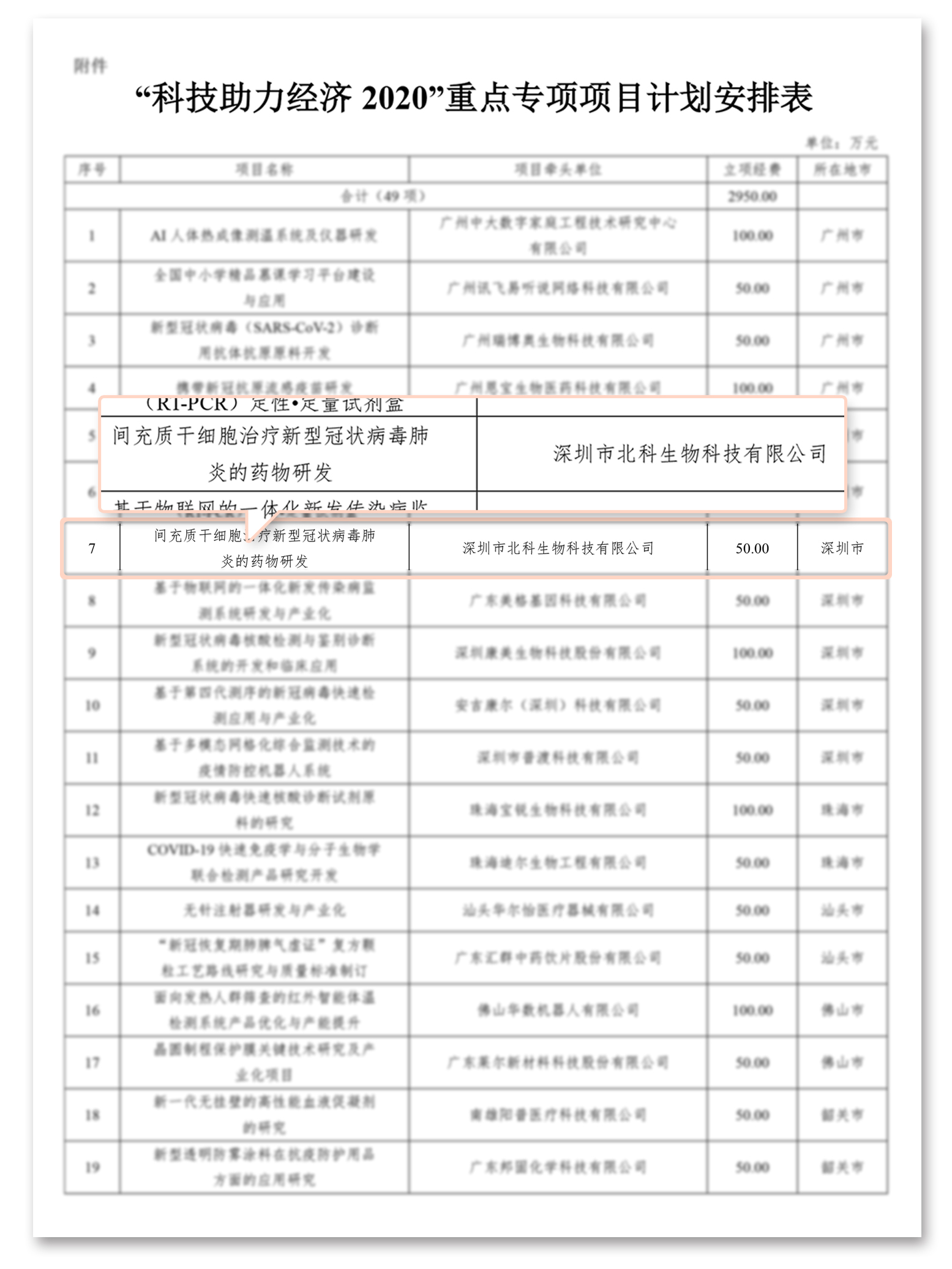 日前,由科技部支持的一批覆蓋國民經(jīng)濟(jì)主要行業(yè)的技術(shù)創(chuàng)新項目陸續(xù)“揭榜”,廣東省科技廳正式發(fā)布了《廣東省科技廳關(guān)于下達(dá)2020年“科技助力經(jīng)濟(jì)2020”重點專項項目計劃的通知》,其中深圳市北科生物科技有限公司(以下簡稱“北科生物”)牽頭的《間充質(zhì)干細(xì)胞治療新型冠狀病毒肺炎的藥物研發(fā)》成功入選,獲“廣東省科技助力經(jīng)濟(jì)2020”重點專項推薦項目。