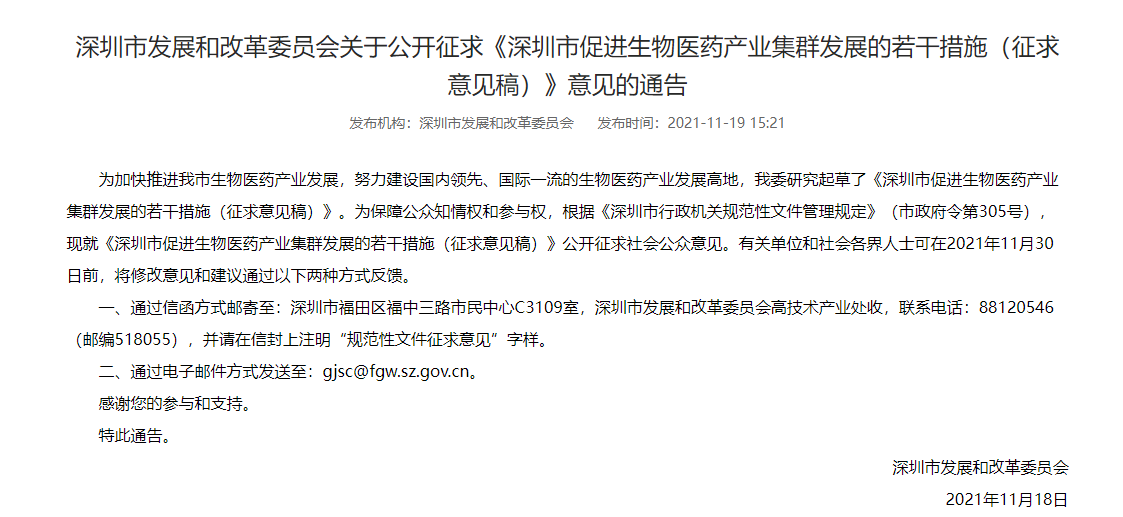 近日,為落實(shí)《中共中央 國務(wù)院關(guān)于支持深圳建設(shè)中國特色社會主義先行示范區(qū)的意見》《深圳市關(guān)于進(jìn)一步加快發(fā)展戰(zhàn)略性新興產(chǎn)業(yè)的實(shí)施方案》(深府〔2018〕84號)等政策精神,充分銜接《深圳市促進(jìn)生物醫(yī)藥產(chǎn)業(yè)集聚發(fā)展指導(dǎo)意見》及相關(guān)配套文件(深府辦〔2020〕2號),加快推進(jìn)我市生物醫(yī)藥產(chǎn)業(yè)發(fā)展,努力建設(shè)國內(nèi)領(lǐng)先、國際一流的生物醫(yī)藥產(chǎn)業(yè)發(fā)展高地,深圳市發(fā)改委研究起草了《深圳市促進(jìn)生物醫(yī)藥產(chǎn)業(yè)集群發(fā)展的若干措施(征求意見稿)》。